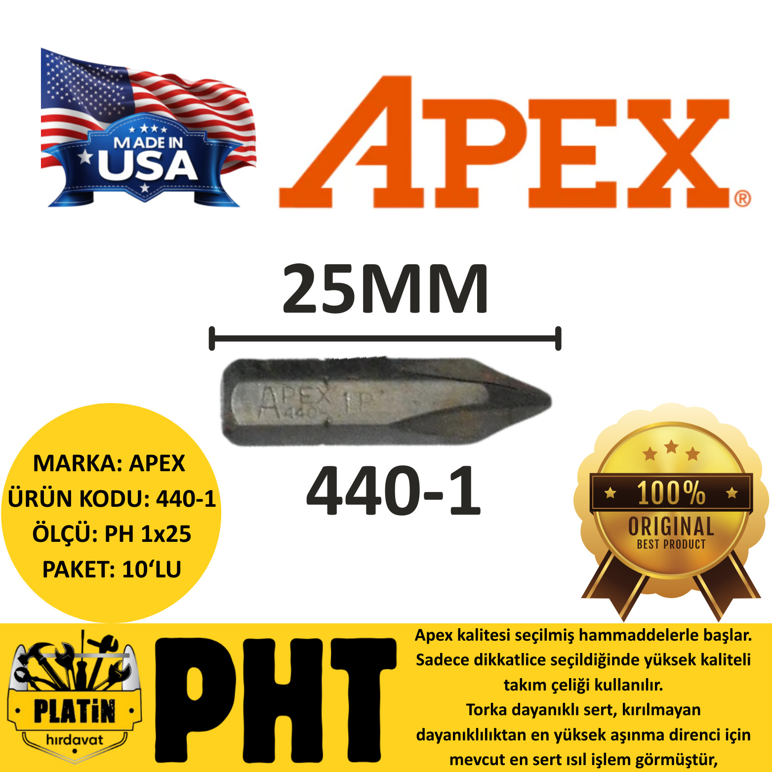 Apex 440-1 Ph 1x25 Yıldız uç Bits 1/4"- 6 Köşe Arkalı Yıldız Uç ( 10 Adet )