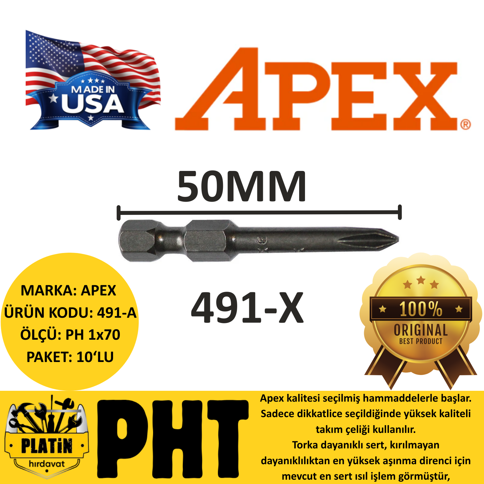 Apex 491 Ph 1x50 Yıldız uç Bits 1/4"- 6 Köşe Arkalı Yıldız Uç ( 10 Adet )