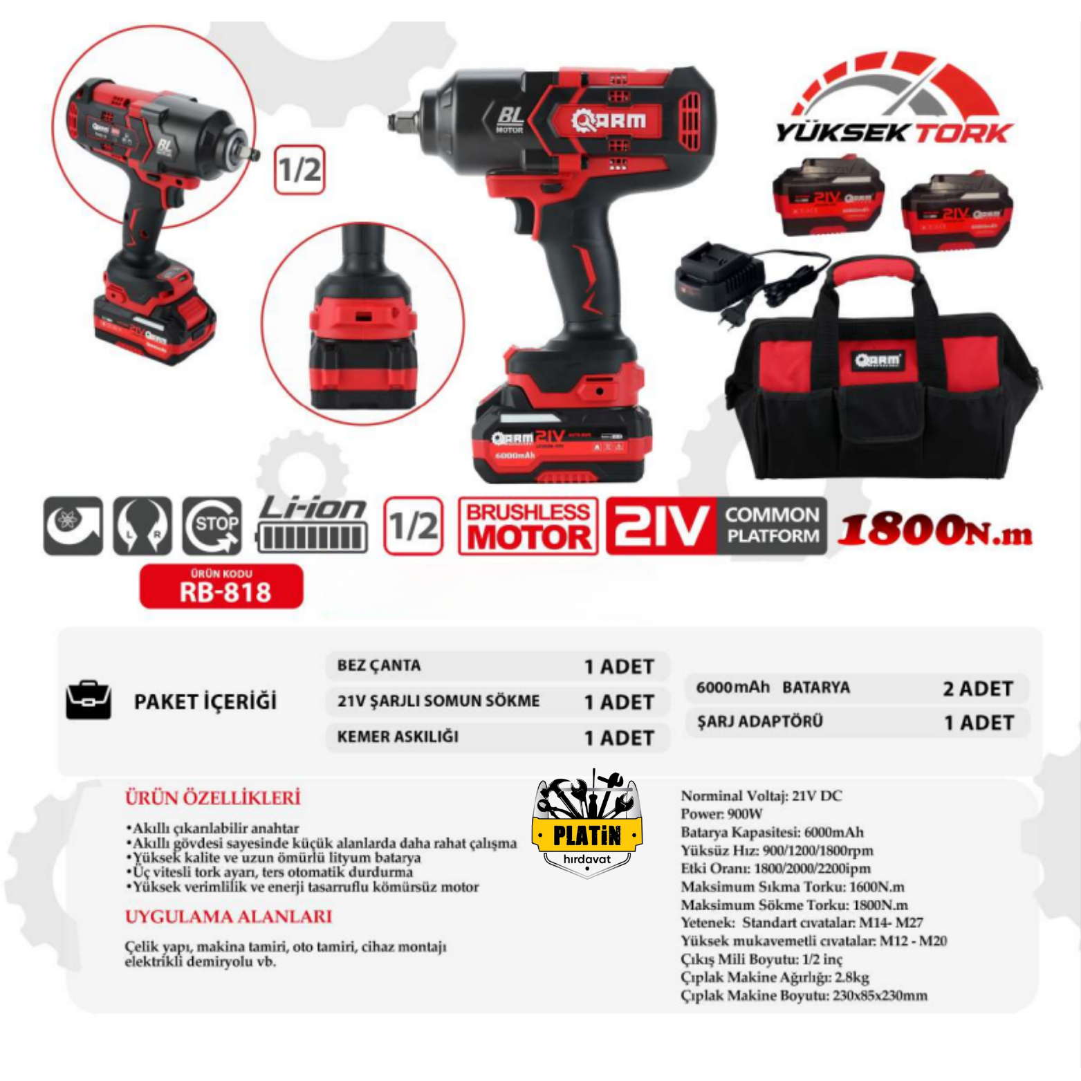 Arm RB-818 Şarjlı Somun Sökme Çift Akülü 1/2 1800Nm