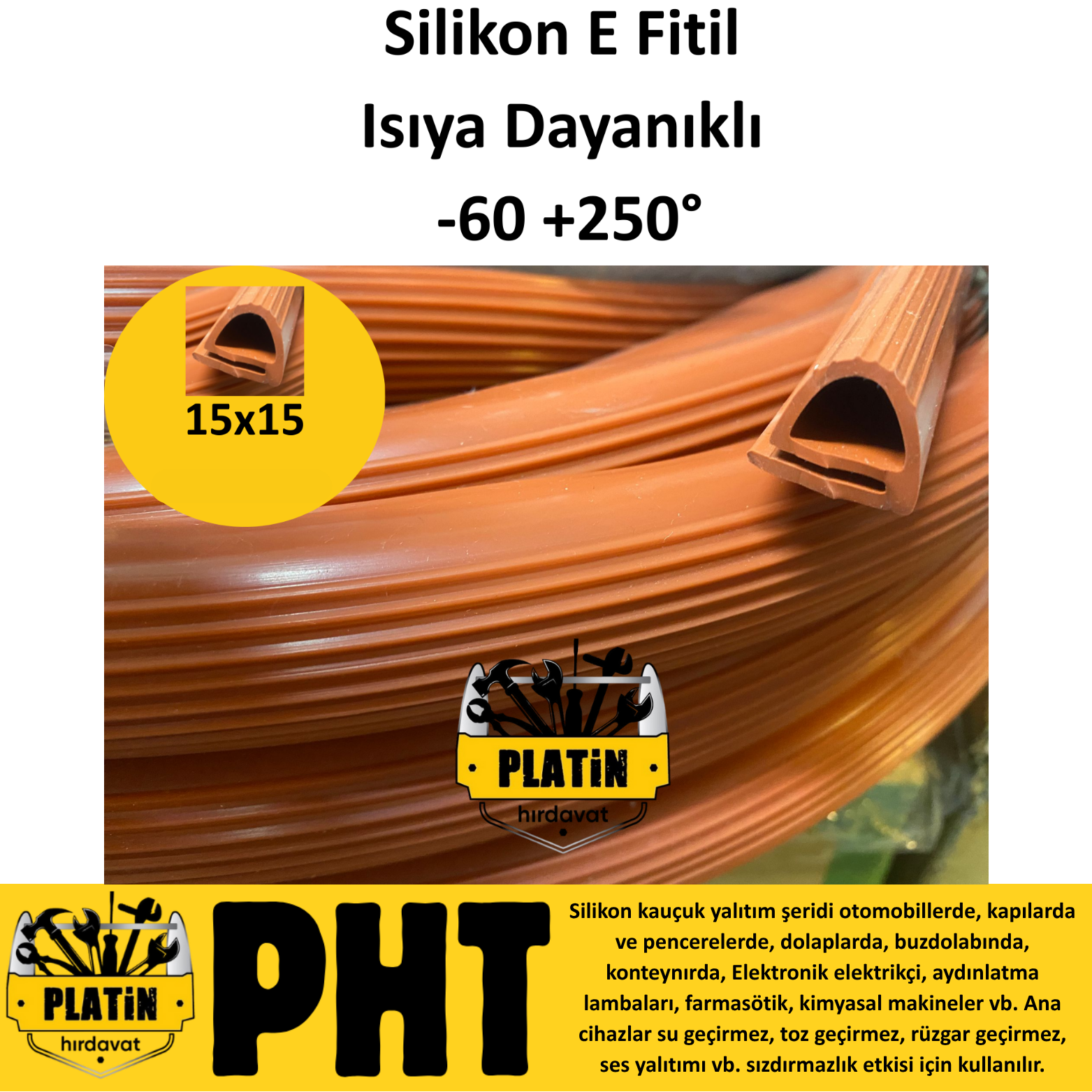 PHT Isıya Dayanıklı Silikon Fırın Cam Contası E Fitili Cam Genişlik 15mm Yükseklik 15mm ( 50 Metre ) PLT28000225