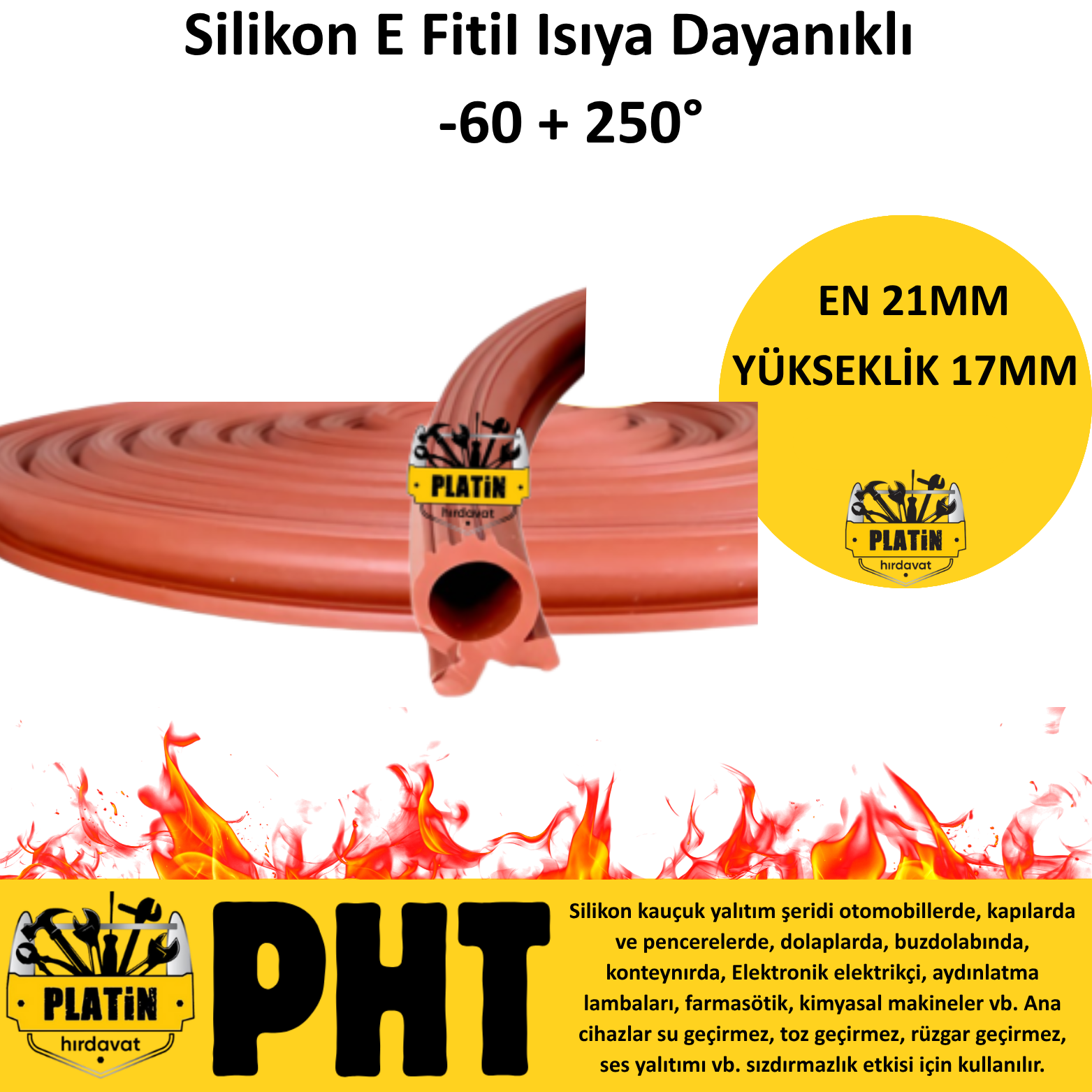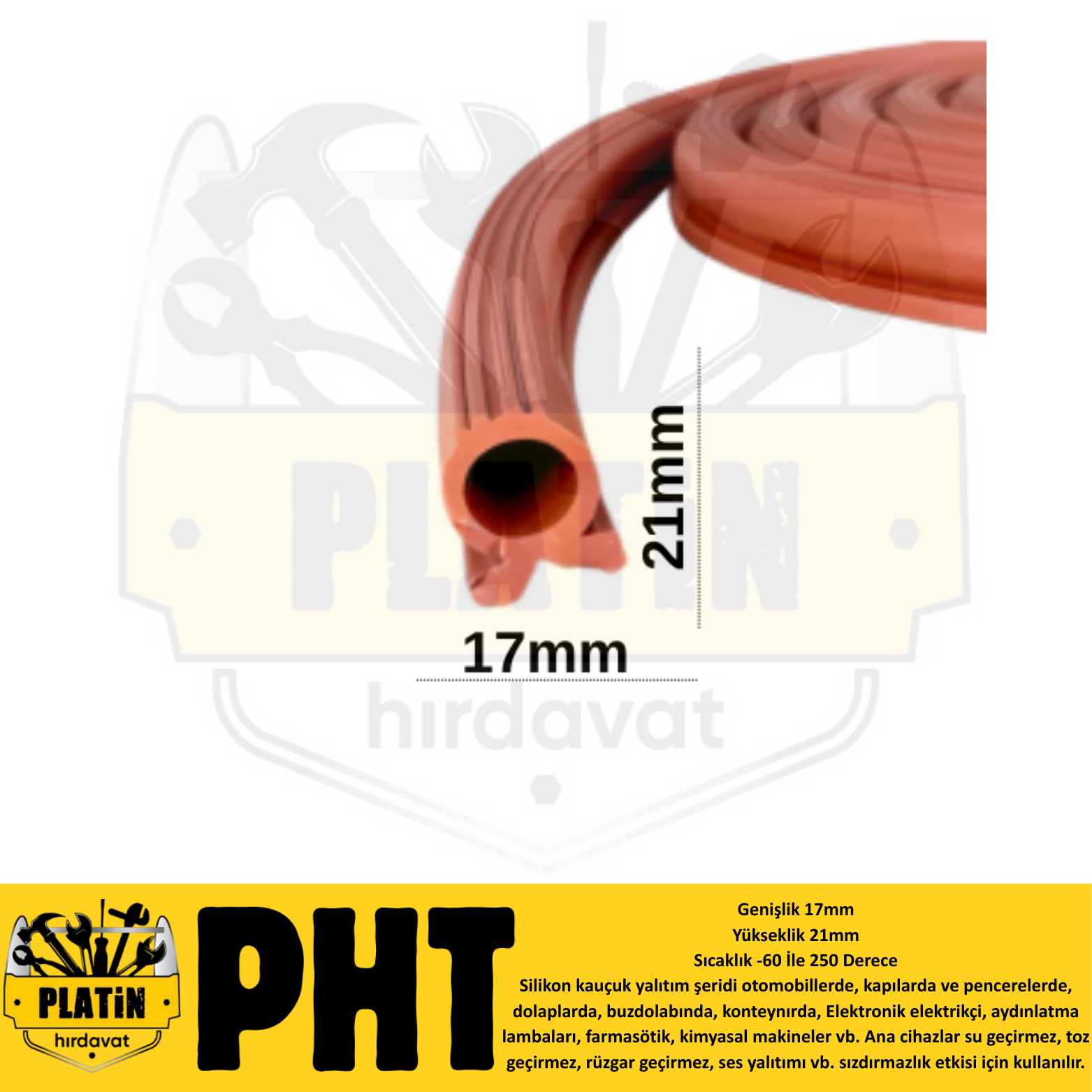 PHT Isıya Dayanıklı Yuvarlak Silikon Fırın Cam Contası Kanallı Fitil Genişlik 17mm Yükseklik 21mm ( 50 Metre ) PLT28000224