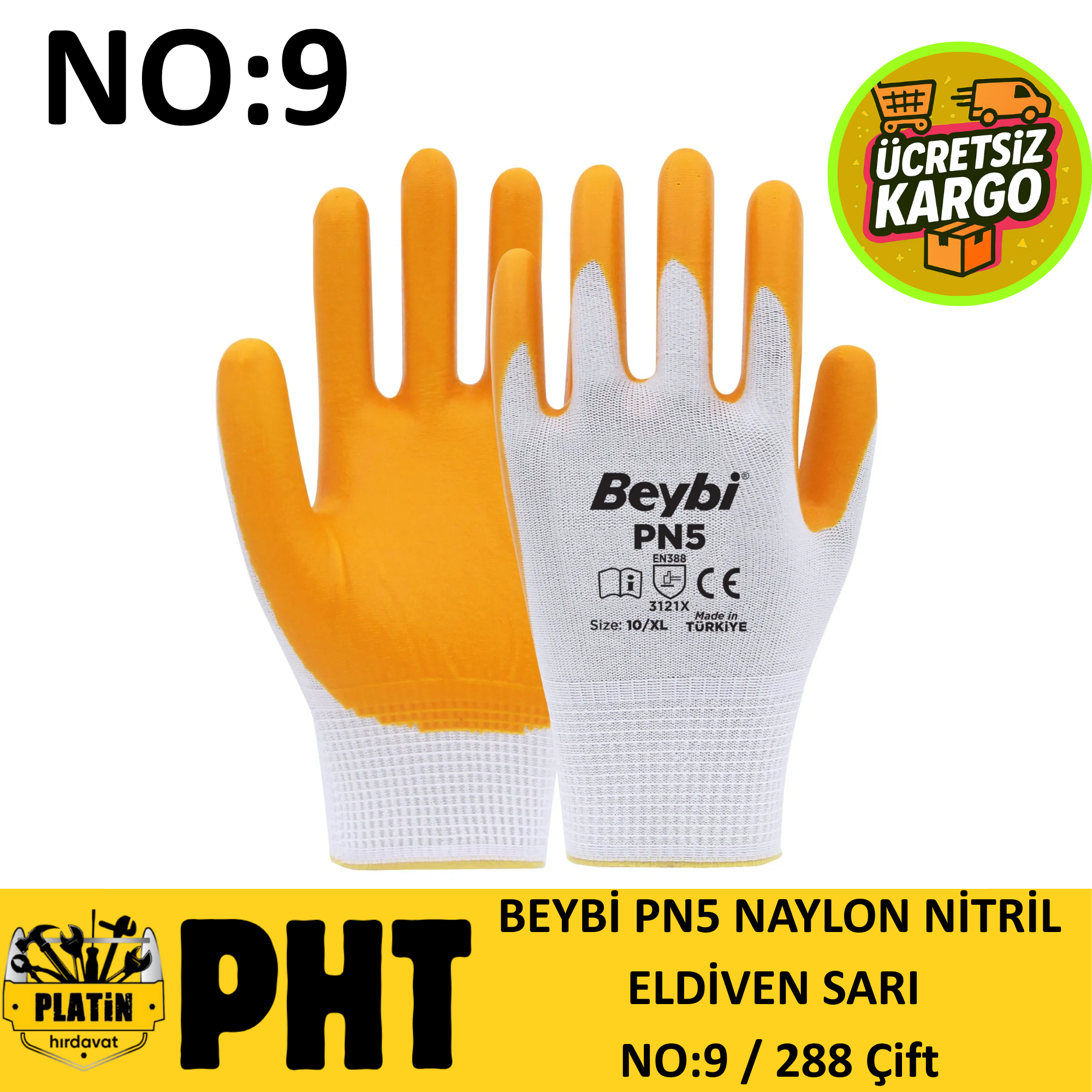 Beybi Naylon Nitril Eldiven No:9 ( 288 Çift ) PN5 Beyaz-Sarı