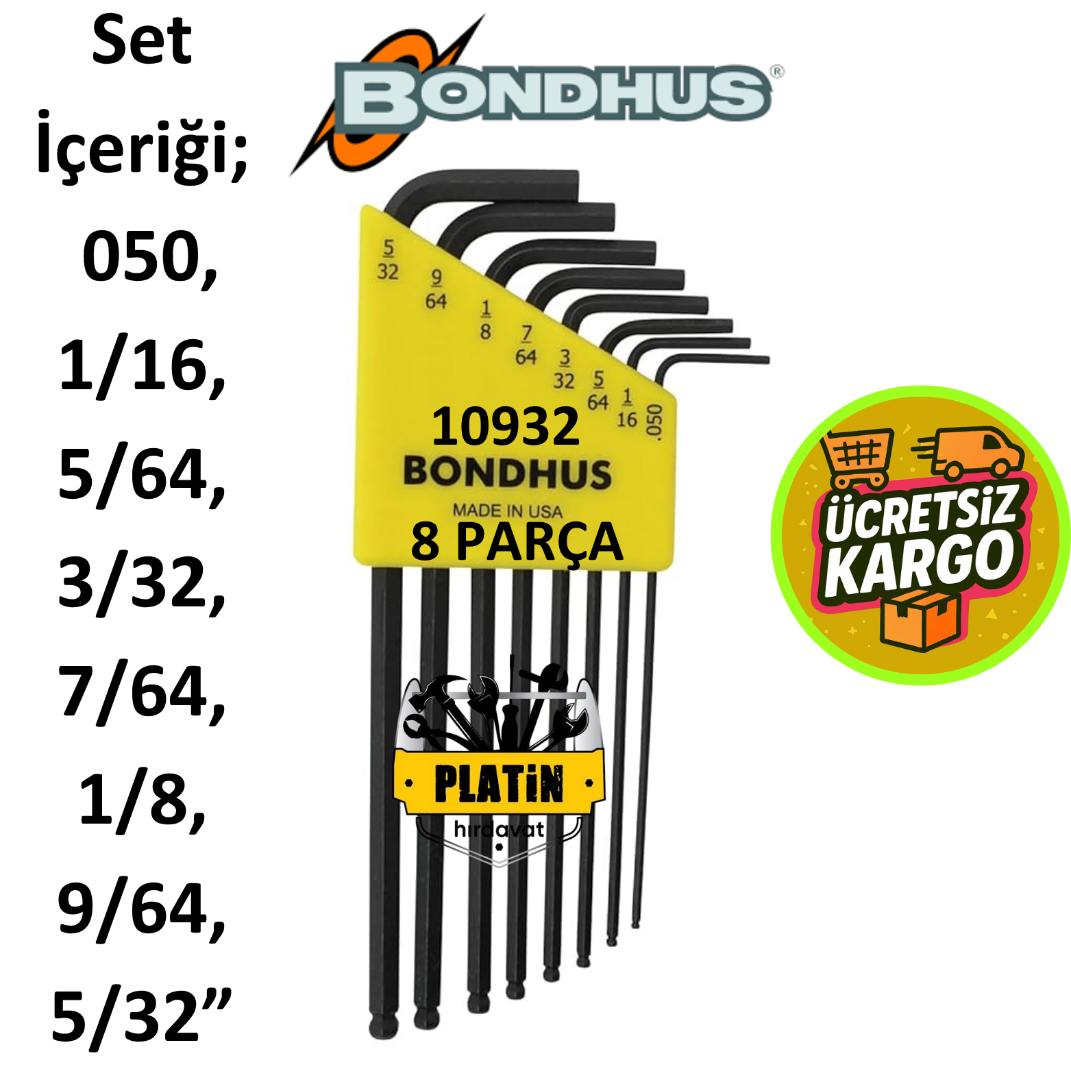 Bondhus 10932 Uzun Top Başlı İnç Ölçü Allen Anahtar Seti Proguard İzole 8 Parça