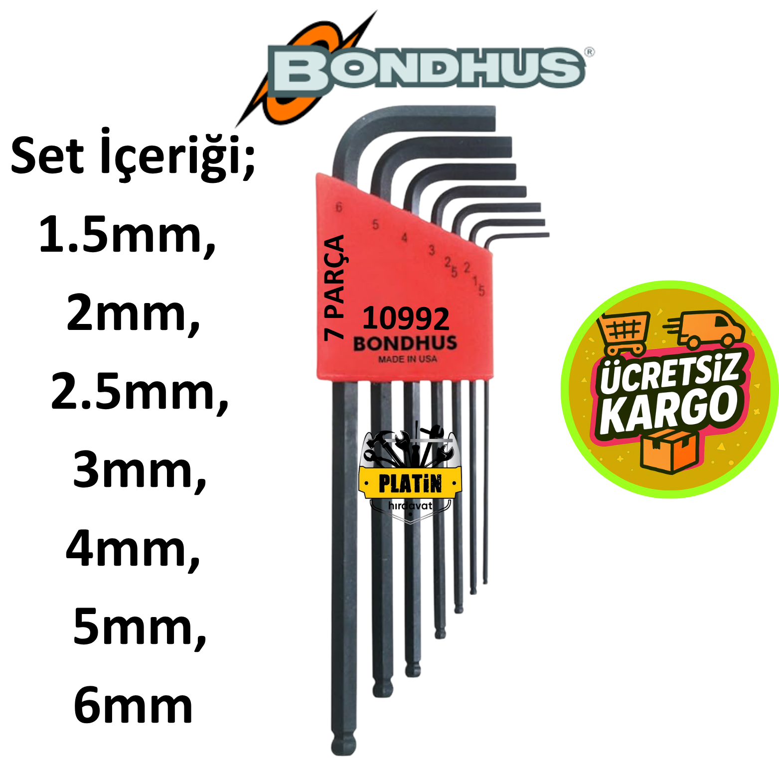 Bondhus 10992 Uzun Top Başlı Metrik Ölçü Allen Anahtar Seti Proguard İzole 7 Parça