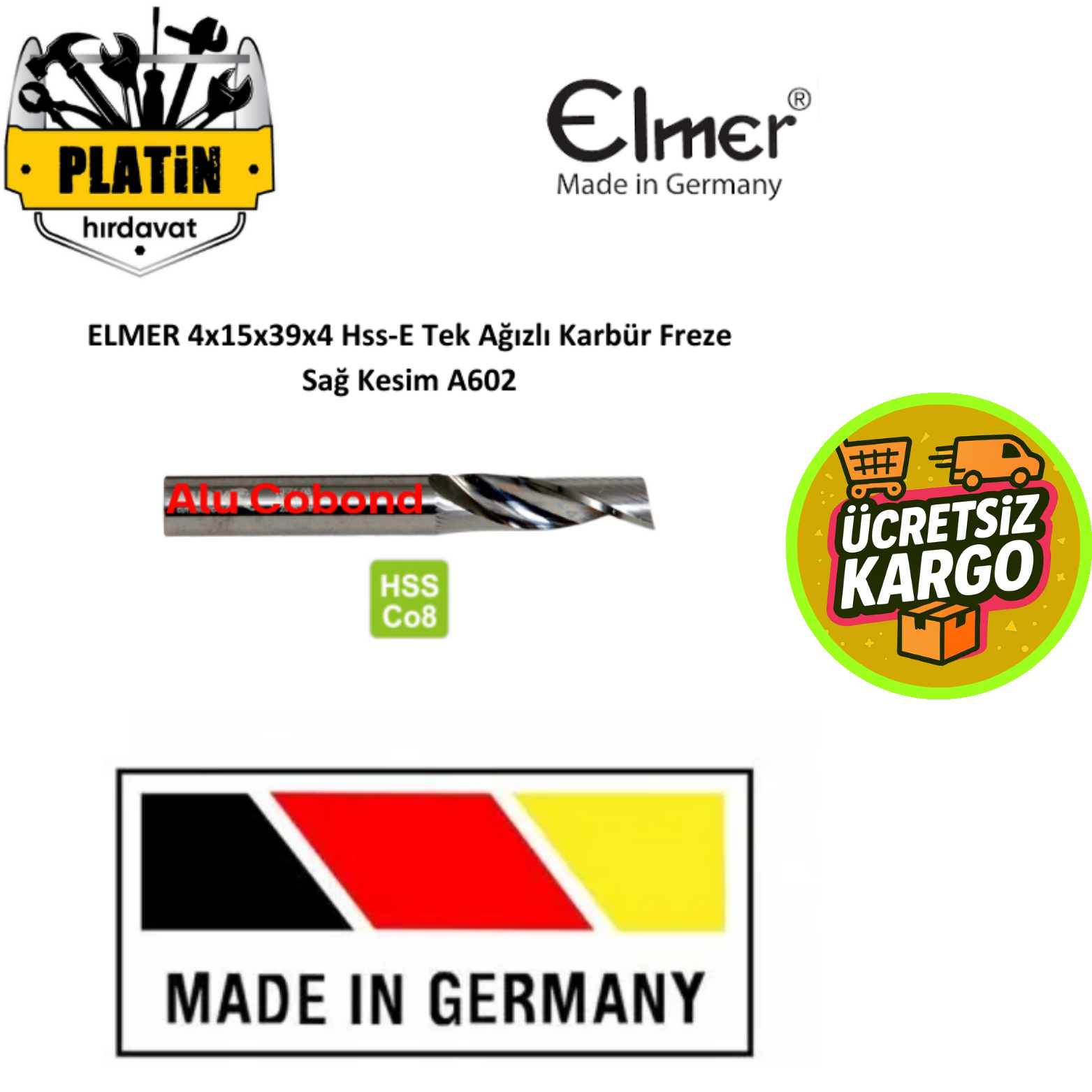 Elmer A602 4x15x39x4 Sağ Kesim Tek Ağızlı Karbür Freze Alu Cobond ( 10 Adet )
