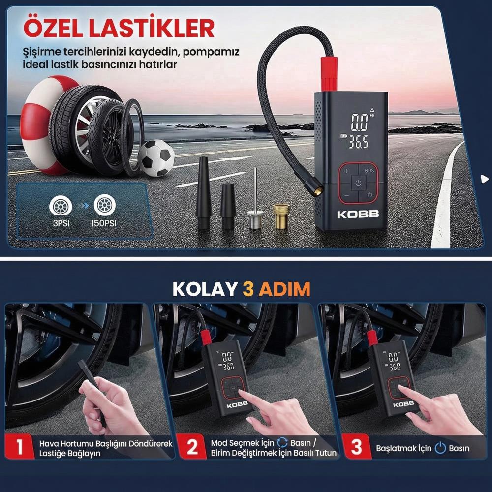 KOBB KB412 Li-ion Şarjlı 150 PSI Dijital Göstergeli Akıllı Lastik Şişirme Pompası+ Powerbank + SOS + Led Lamba