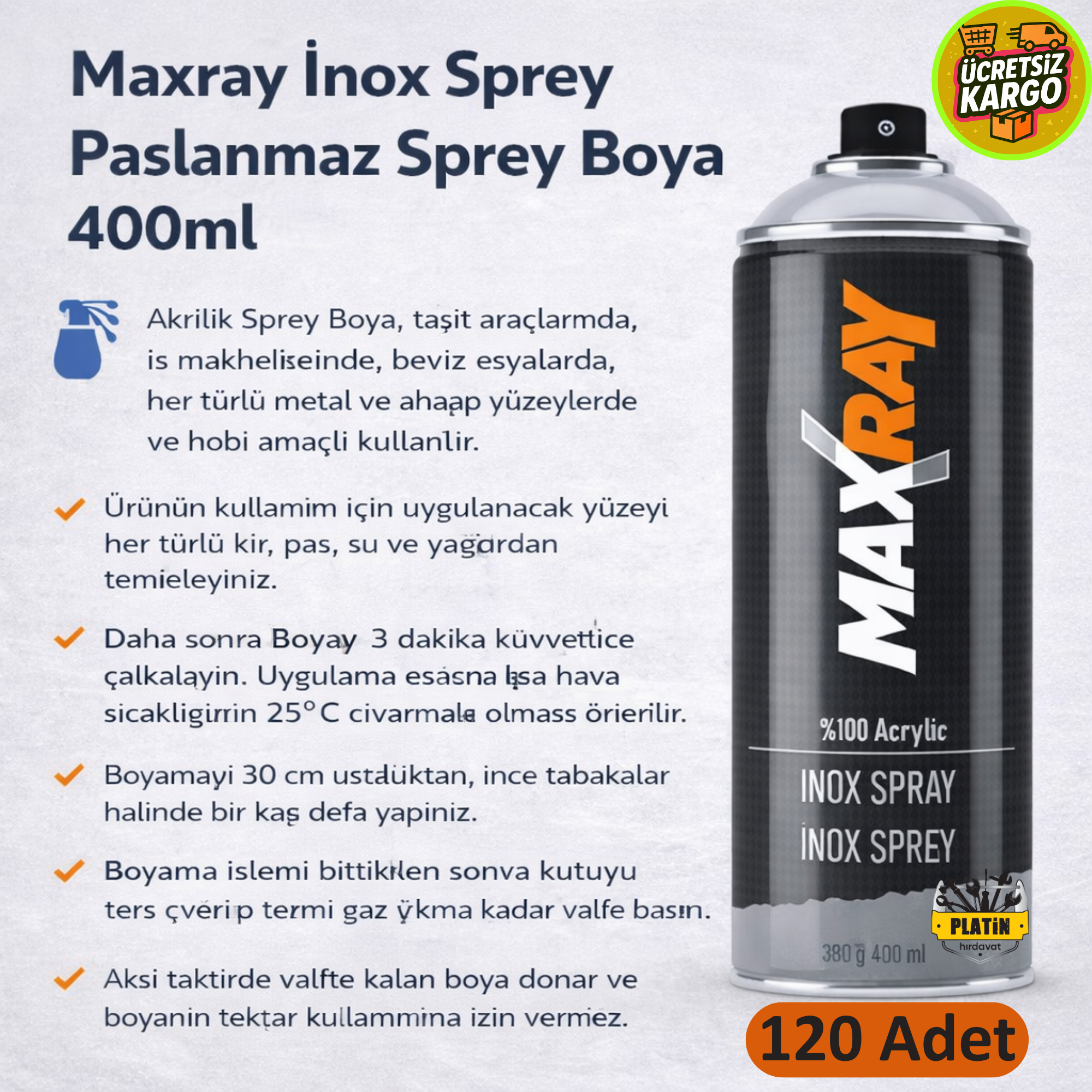 Maxray İnox Sprey Paslanmaz Sprey Boya 400ml ( 120 Adet ) PLT28000502