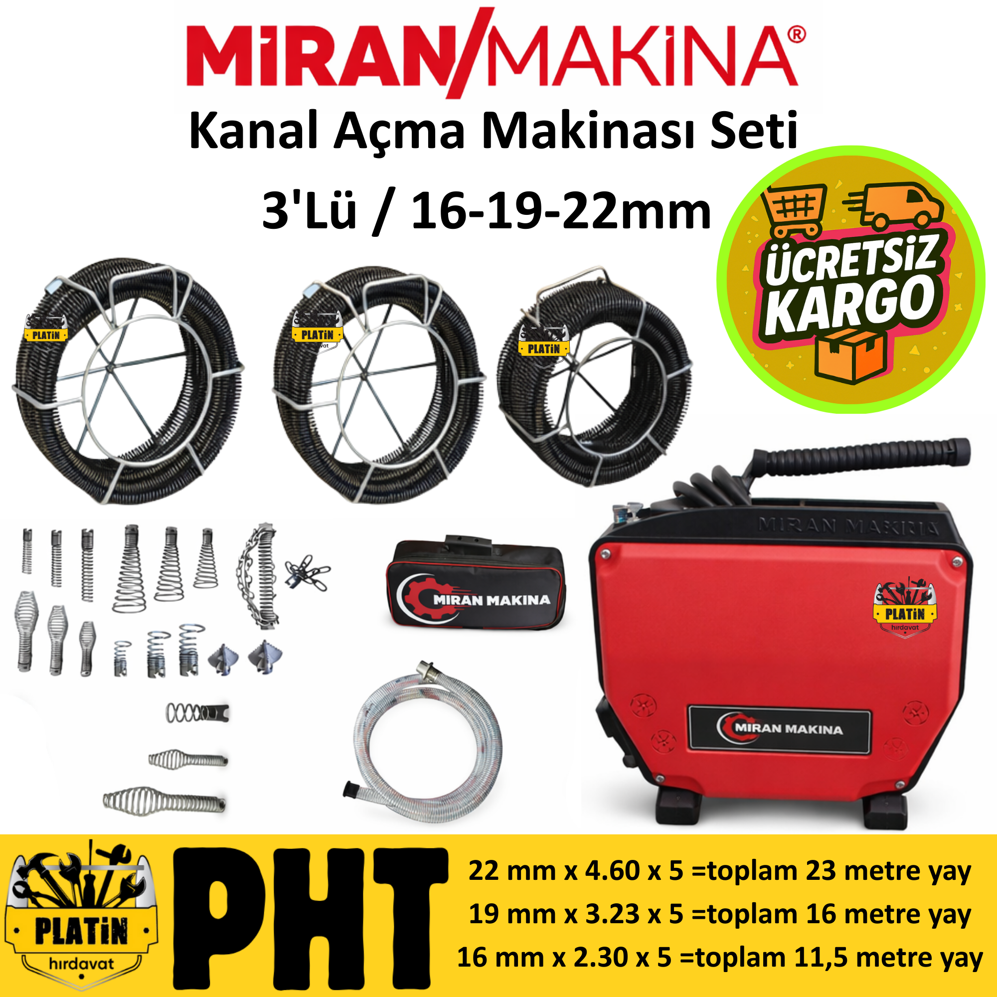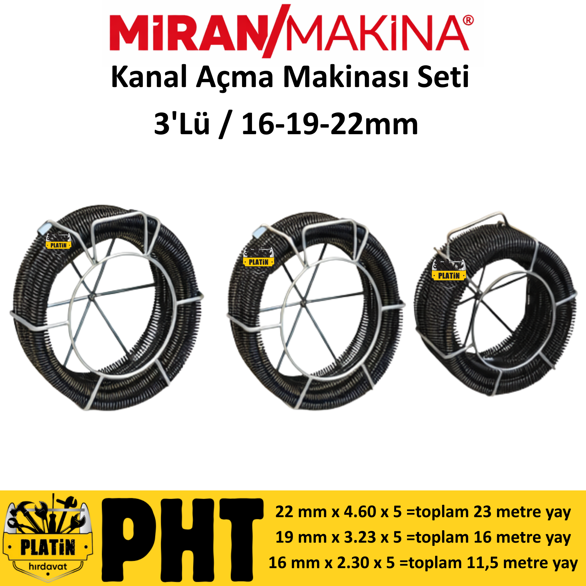 Miran Tıkanıklık Kanal Açma Makinası 22/19/16 mm spirali 3' Lü set PLT28000013
