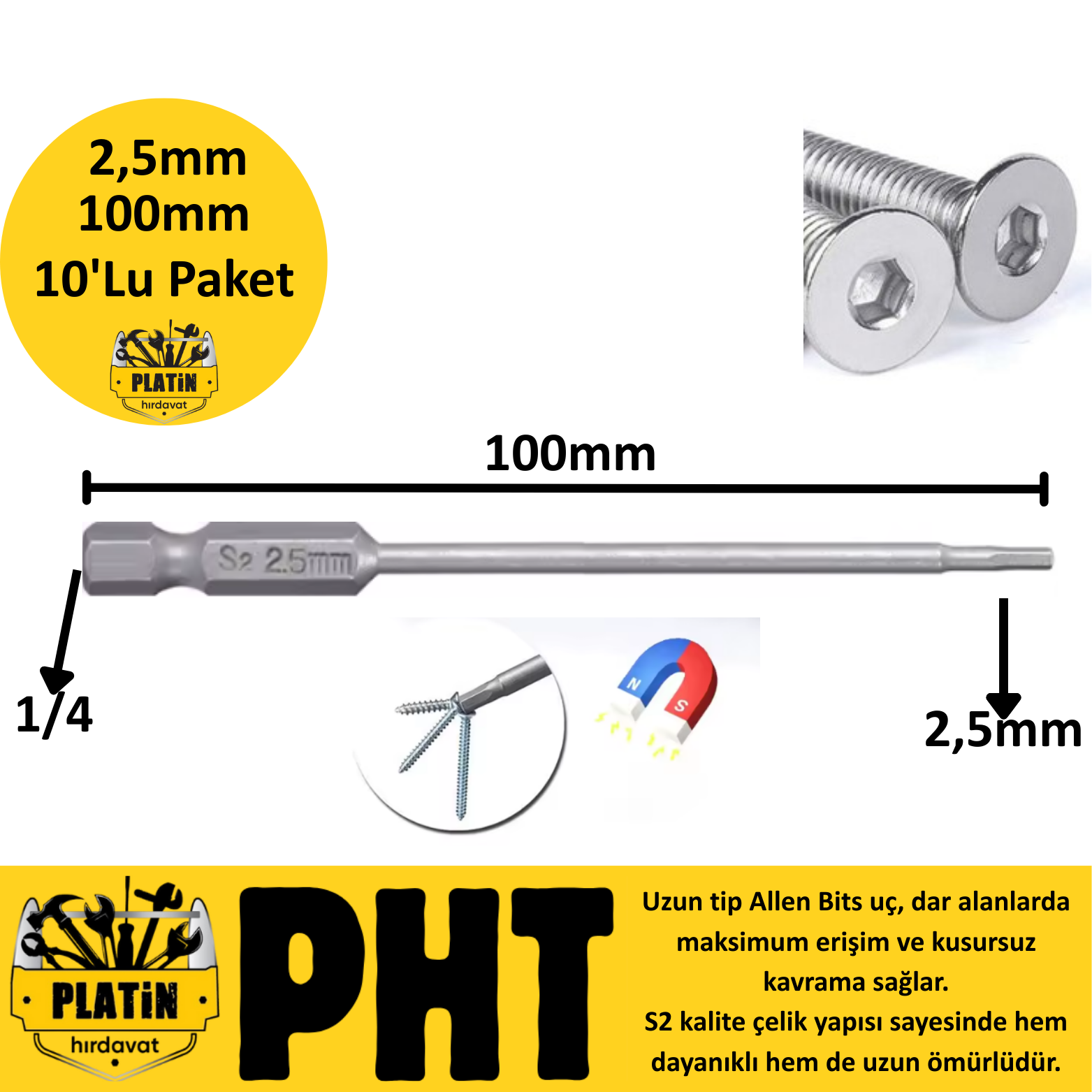 PHT Allen Bits Uç Uzun Boy Hex 2,5mm X 100mm plt280073 ( 10 Adet )