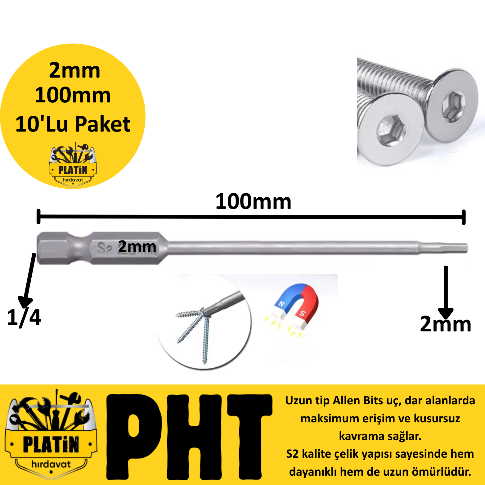 PHT Allen Bits Uç Uzun Boy Hex 2mm X 100mm plt280072 ( 10 Adet )