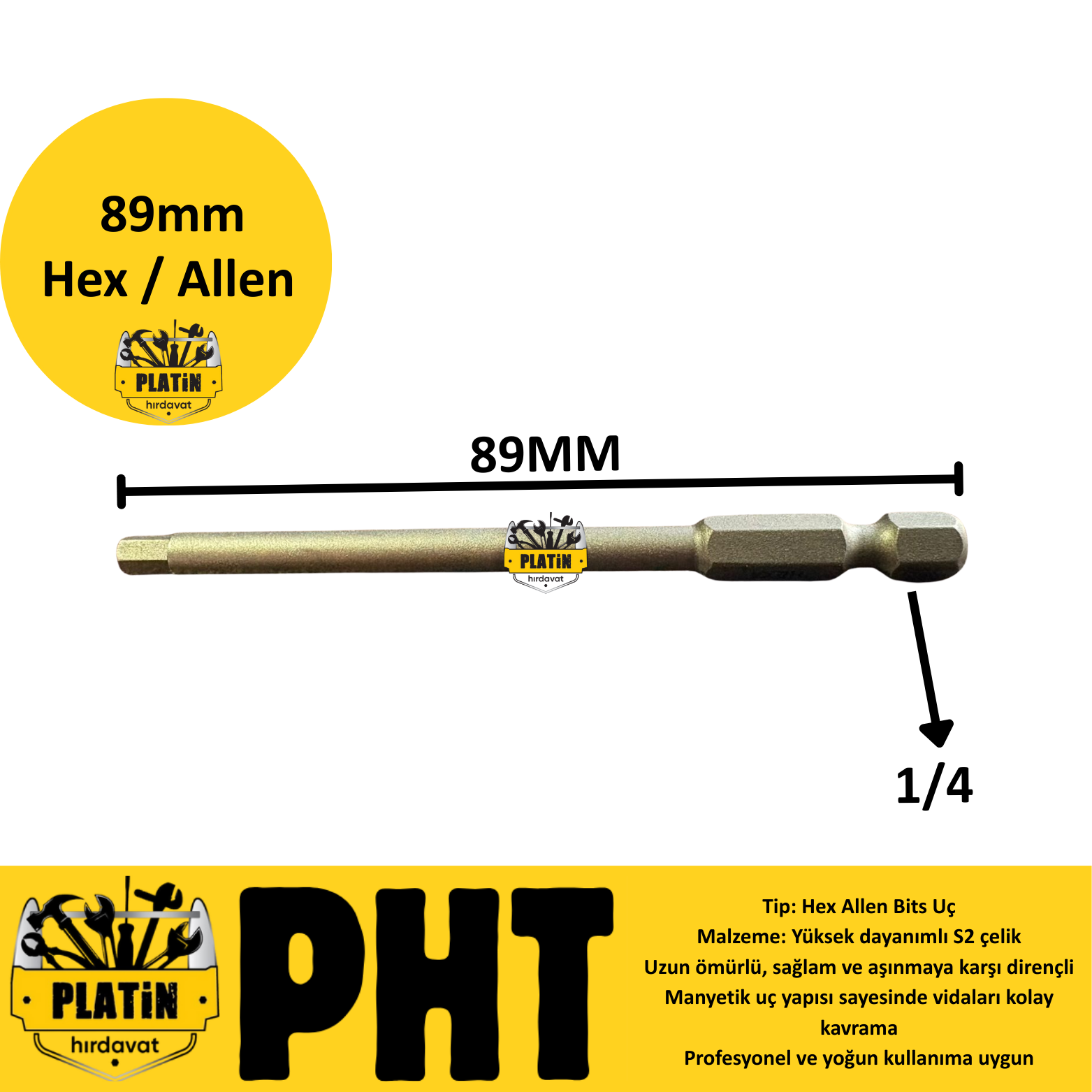 PHT marka 2 mm uzun tip hex bits uç, 89 mm boyu sayesinde dar ve derin bölgelere kolay erişim sağlar.