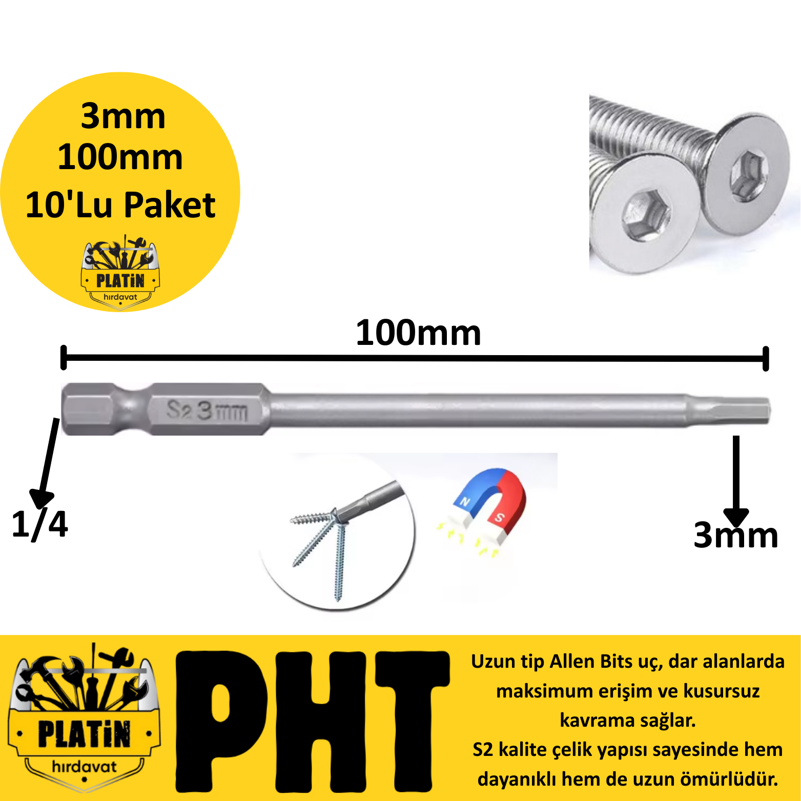 PHT Allen Bits Uç Uzun Boy Hex 3mm X 100mm plt280074 ( 10 Adet )