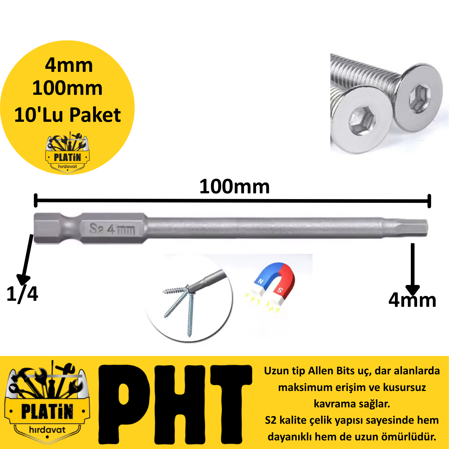 PHT Allen Bits Uç Uzun Boy Hex 4mm X 100mm plt280076 ( 10 Adet )