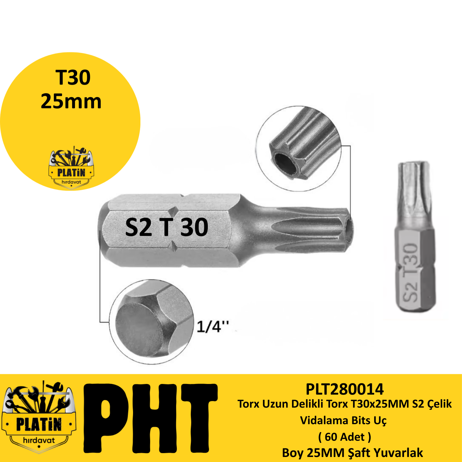 PHT Delikli Torx Bits Uç Kısa T30x25mm ( 60 Adet ) PLT280014