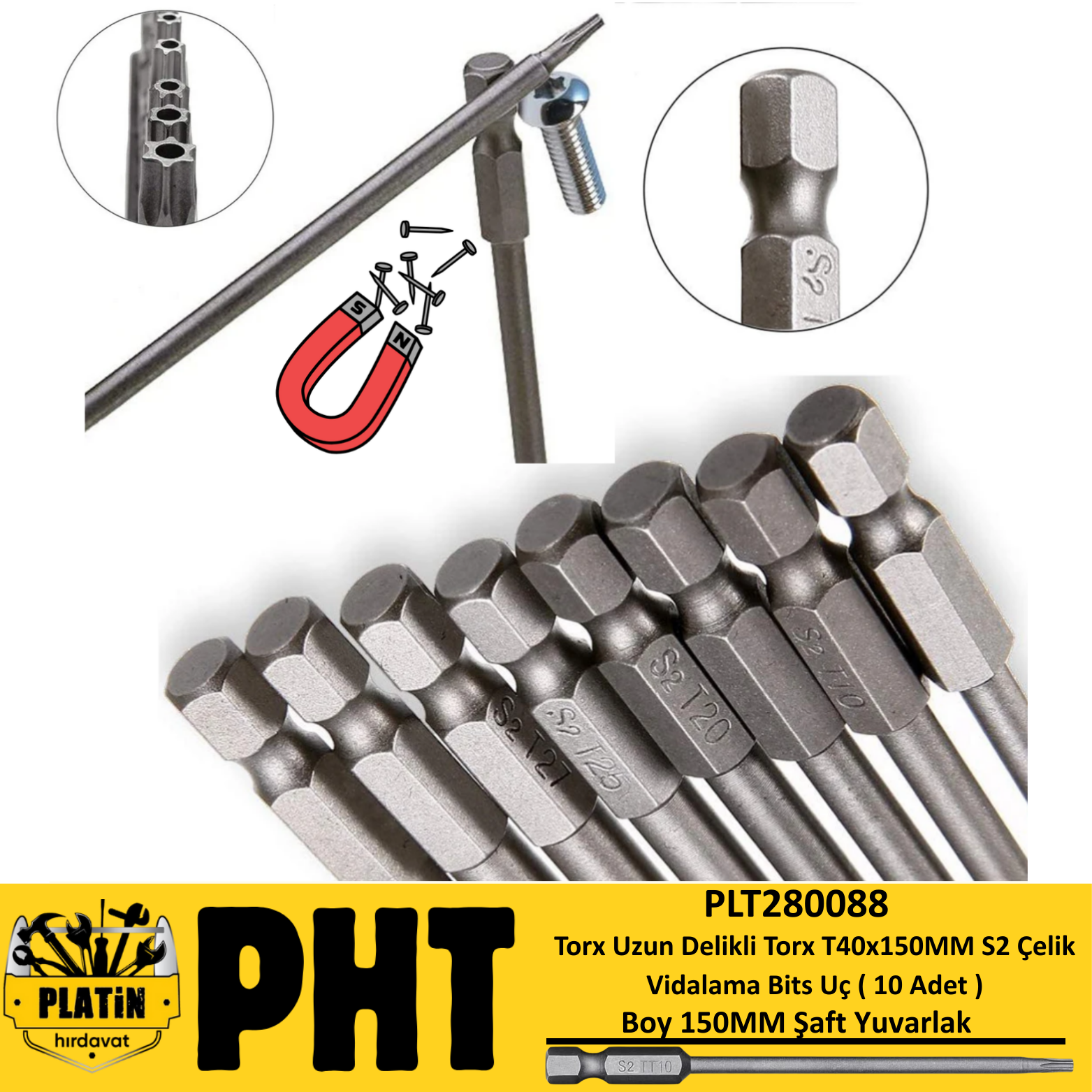 PHT Torx Uzun Delikli Torx T40x150MM S2 Çelik Vidalama Bits Uç ( 10 Adet ) PLT280088