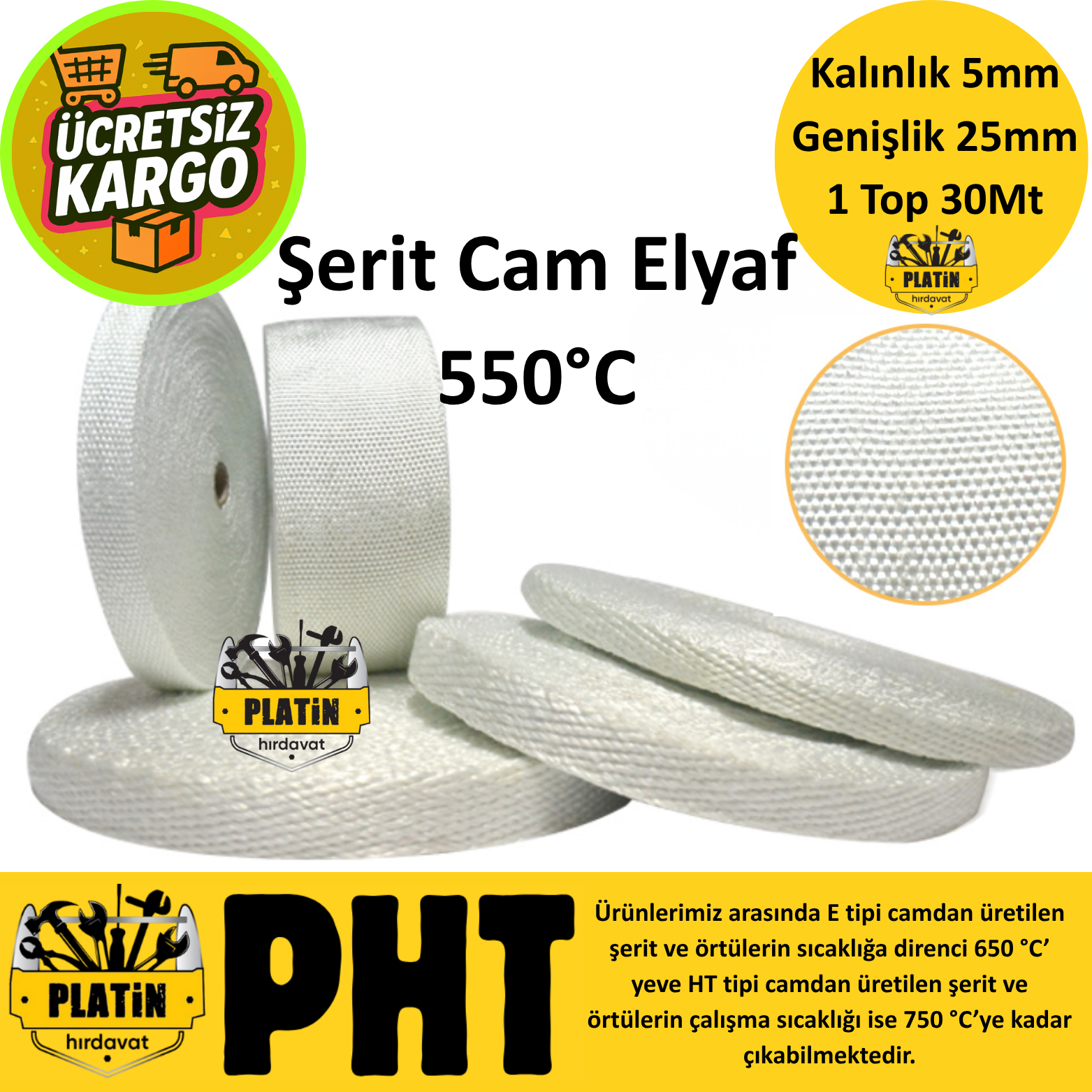 PHT Şerit Cam Elyaf 550°C 25mm x 5mm ( 1 Top 30 Metre ) plt590