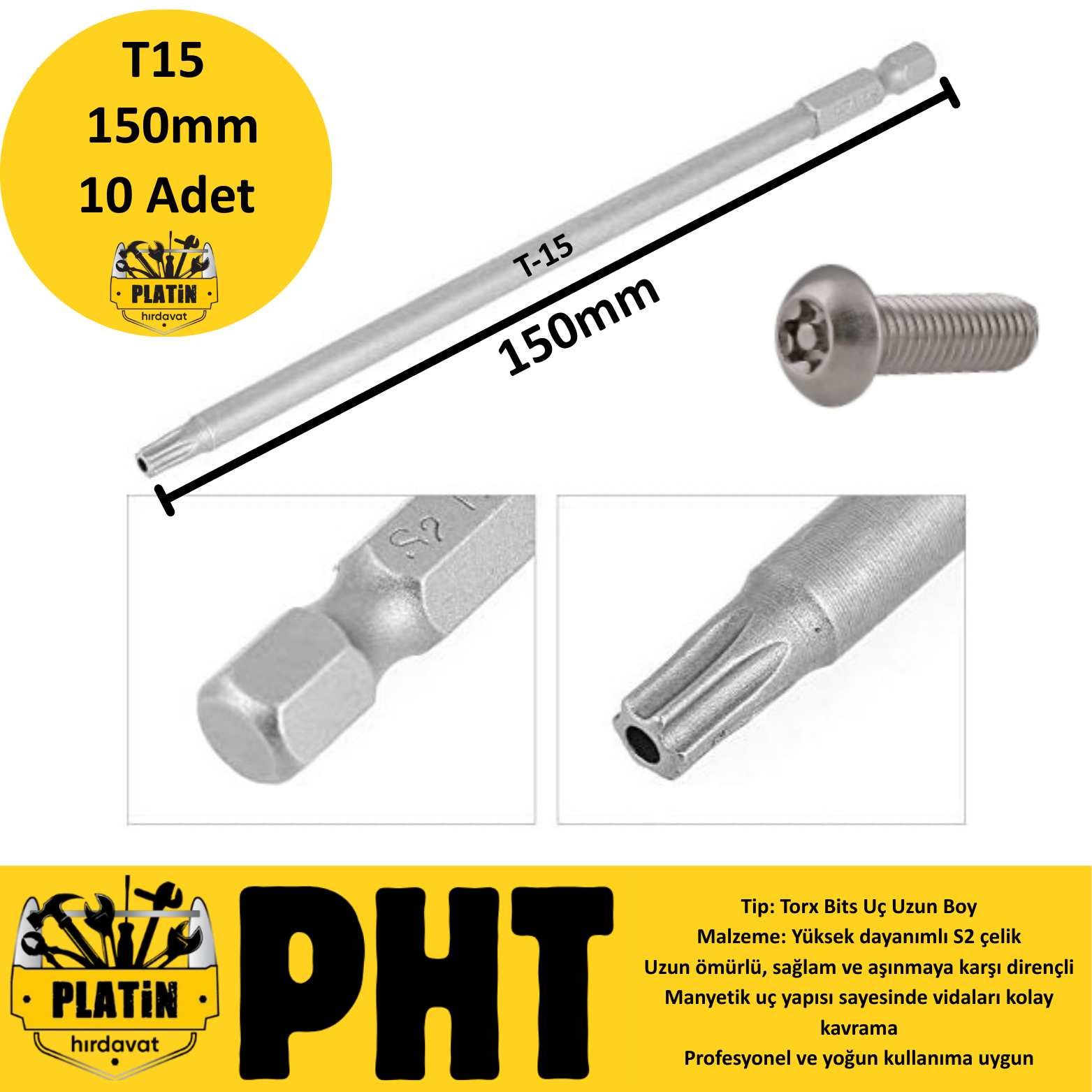 PHT Torx Uzun Delikli Torx T15x150MM S2 Çelik Vidalama Bits Uç plt2800203 ( 10 Adet )
