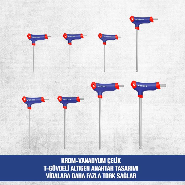 WORKPRO WP200542 8 Parça CR-V Top Başlı T Tipi Uzun Profesyonel Allen Anahtar Takımı