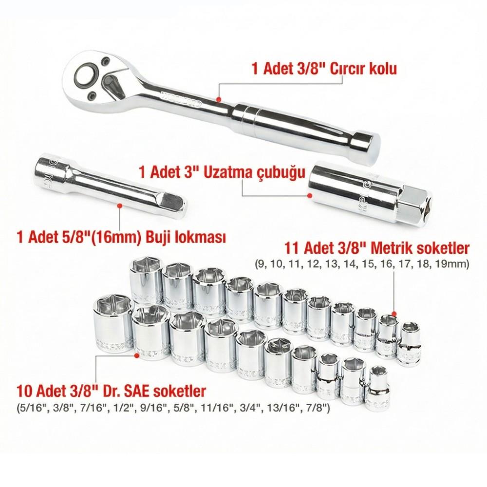 WORKPRO WP202541 3/8'’ CR-V 24 Parça Metrik/İnç Ağır Hizmet Lokma Takımı