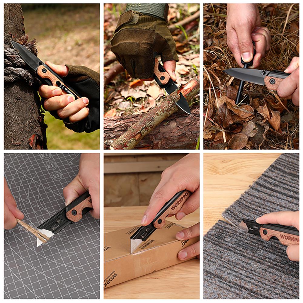 WORKPRO WP211015 2-IN-1 Ahşap Saplı Profesyonel Cep Çakısı & Katlanır Rötuş Maket Bıçağı + 11 Adet Yedek Bıçak