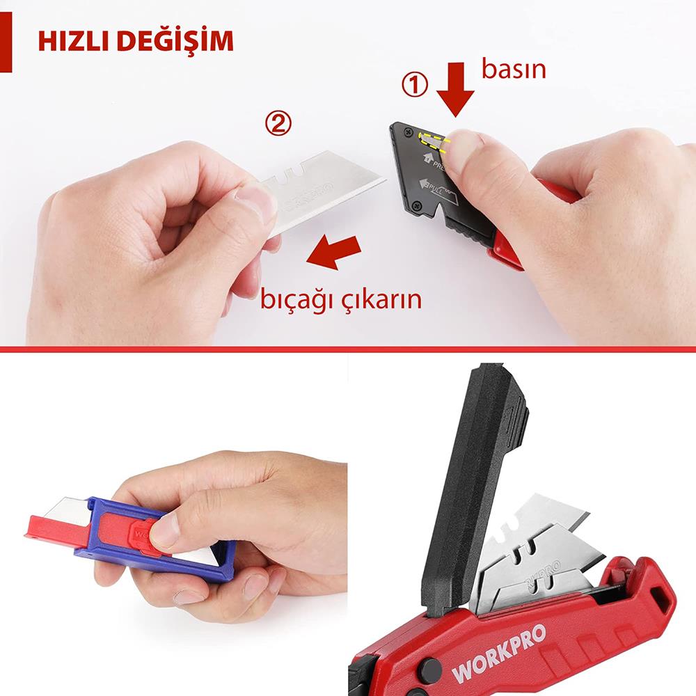WORKPRO WP211026 Katlanır Çok Amaçlı Profesyonel Rötuş Maket Bıçağı + 14 Adet Yedek Bıçak