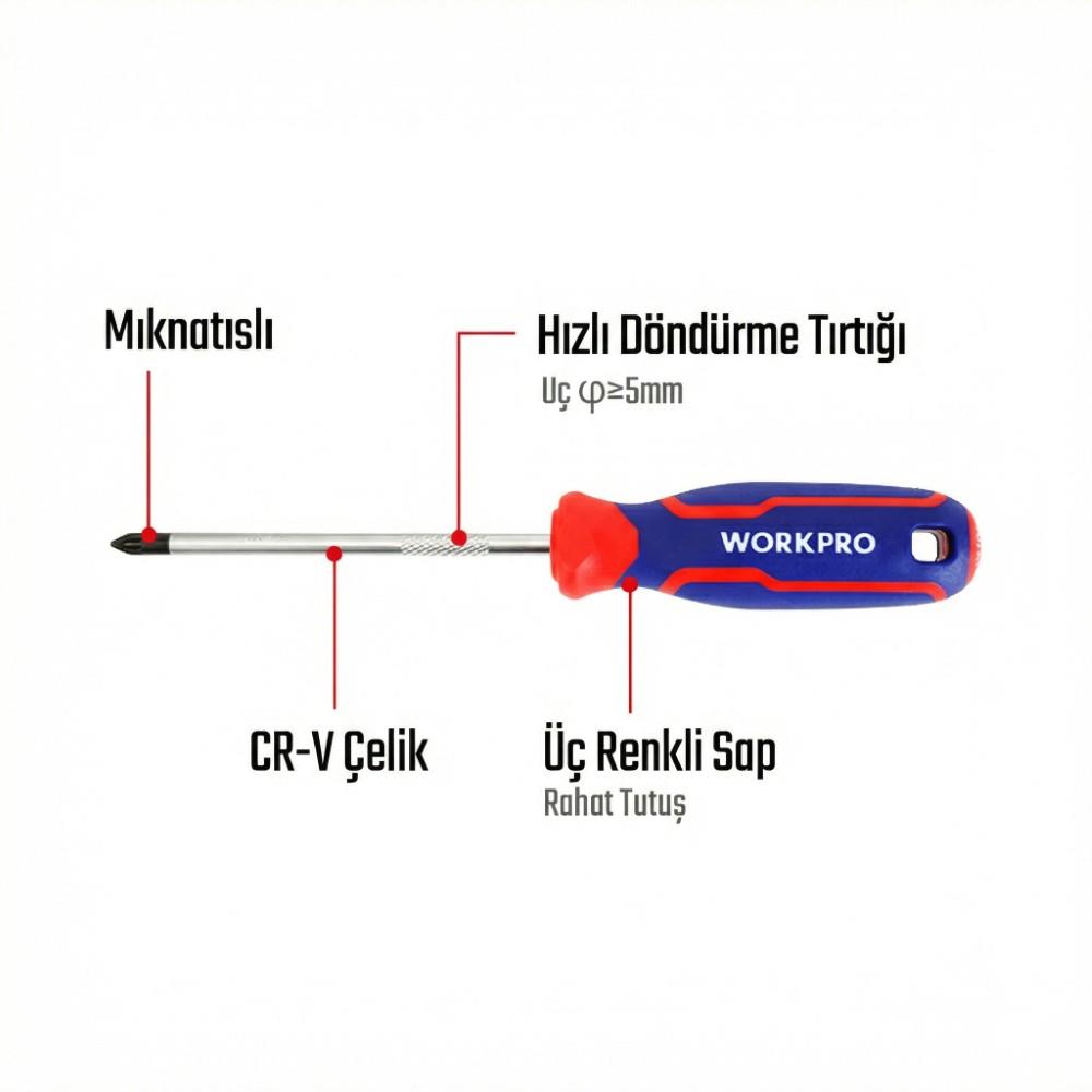 WORKPRO WP221036 PZ1x100mm CR-V Manyetik Profesyonel Yıldız Tornavida